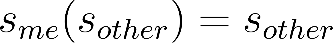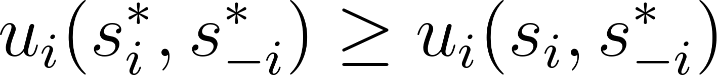 The utility () I get playing my equilibrium strategy () given what others do (), is greater than or equal to the utility I would get if I switched my strategy to any other (), keeping the strategies of others fixed.